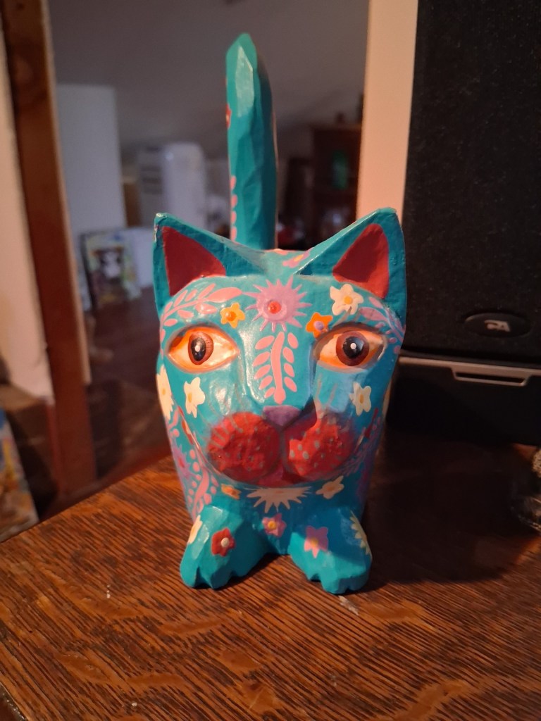 Audience, left to right – blue kitty, buddha, me, fabric kitty. And then another of those Portland ‘Bangs!’ because in a lightning-like particular moment I felt exactly like I was in a movie theater. We all were. Like totally. The four of us, watching the meditation show. Straight outta Lexington.