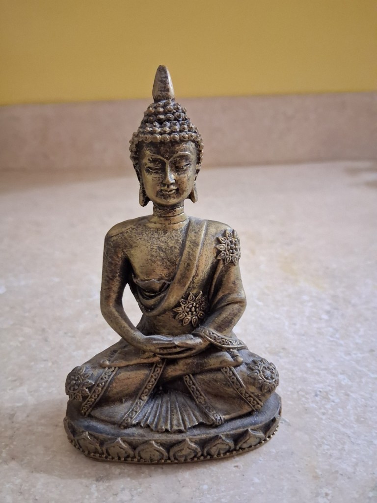And then the coolest thing happened. I turned the buddha and I turned the kitty so they, too, were facing the monitor screen, like me, and so as to not leave anyone out, I brought this one over from the other side of the desk to face the screen too:
